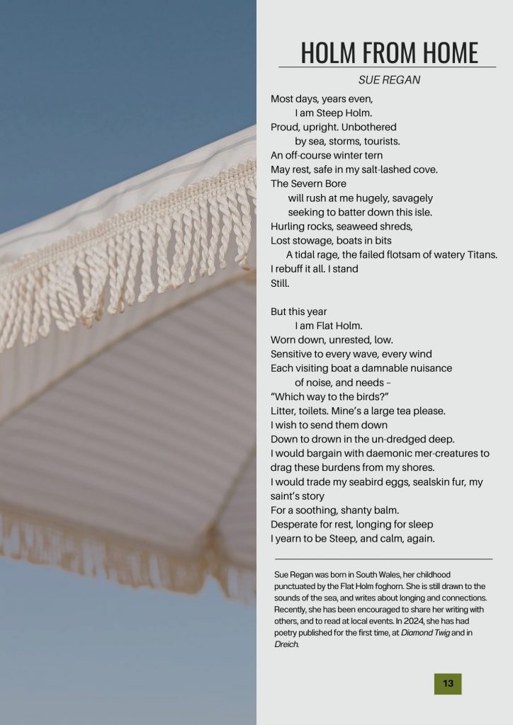Sue Regan was born in South Wales, her childhood punctuated by the Flat Holm foghorn. She is still drawn to the sounds of the sea, and writes about longing and connections. Recently, she has been encouraged to share her writing with others, and to read at local events. In 2024, she has had poetry published for the first time, at Diamond Twig and in Dreich.