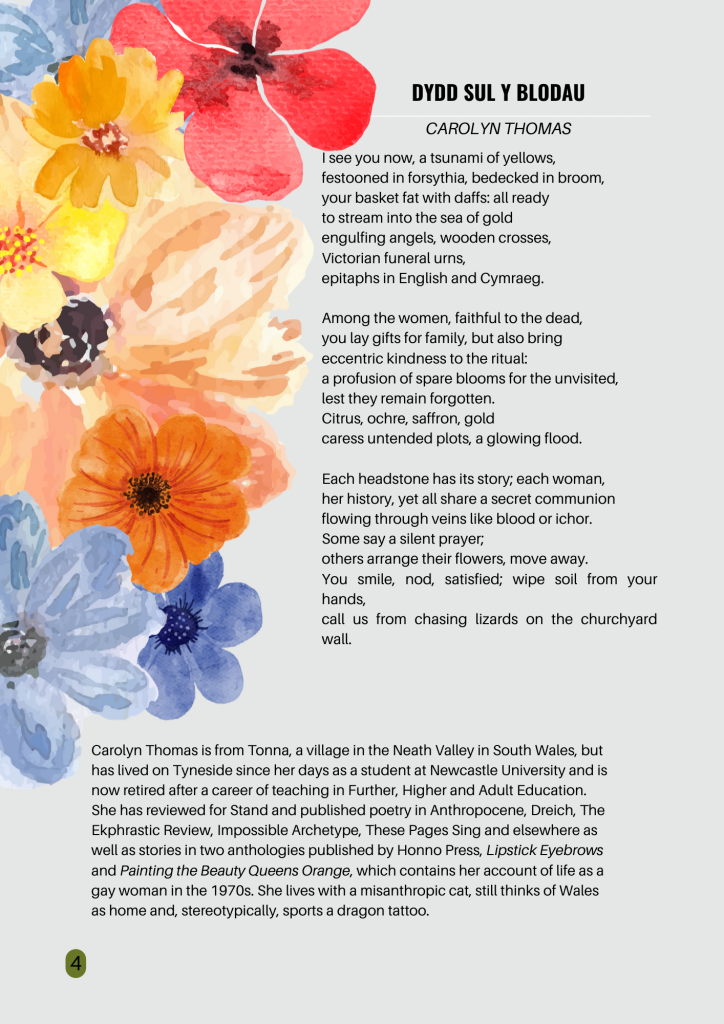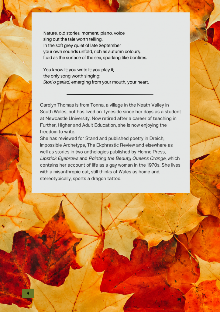 Carolyn Thomas is from Tonna, a village in the Neath Valley in South Wales, but has lived on Tyneside since her days as a student at Newcastle University. Now retired after a career of teaching in Further, Higher and Adult Education, she is now enjoying the freedom to write. She has reviewed for Stand and published poetry in Dreich, Impossible Archetype, The Ekphrastic Review and elsewhere as well as stories in two anthologies published by Honno Press, Lipstick Eyebrows and Painting the Beauty Queens Orange, which contains her account of life as a gay woman in the 1970s. She lives with a misanthropic cat, still thinks of Wales as home and, stereotypically, sports a dragon tattoo.